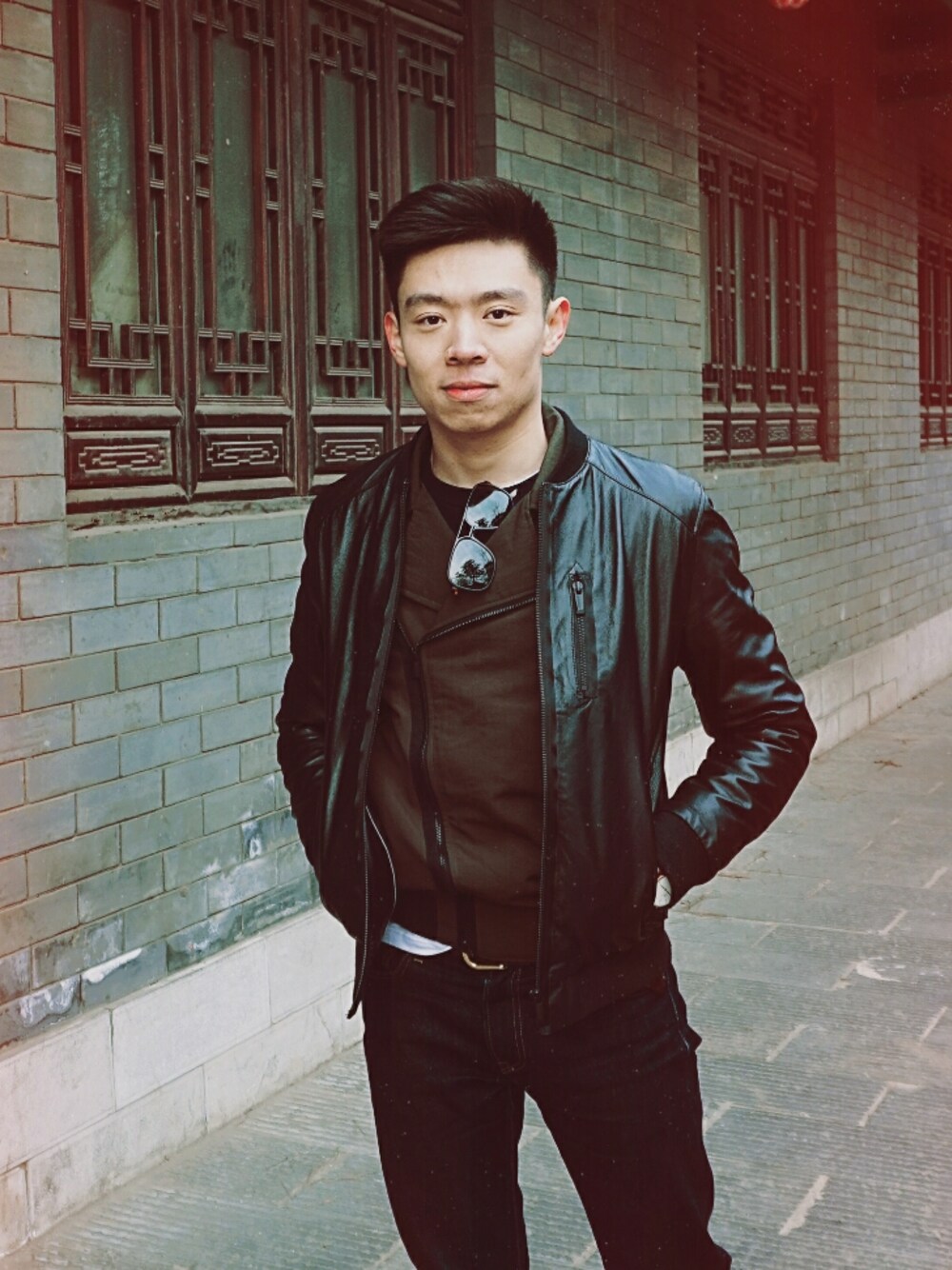 上身叠穿(从里到外依次为白色打底衫,藏蓝色修身卫衣,机车外套,皮衣)营造层次感,下身修身直筒丹宁牛仔挽起裤脚,搭配白色stan smith板鞋,用墨镜及腕表加以点缀,打造小叛逆的休闲运动混搭风。