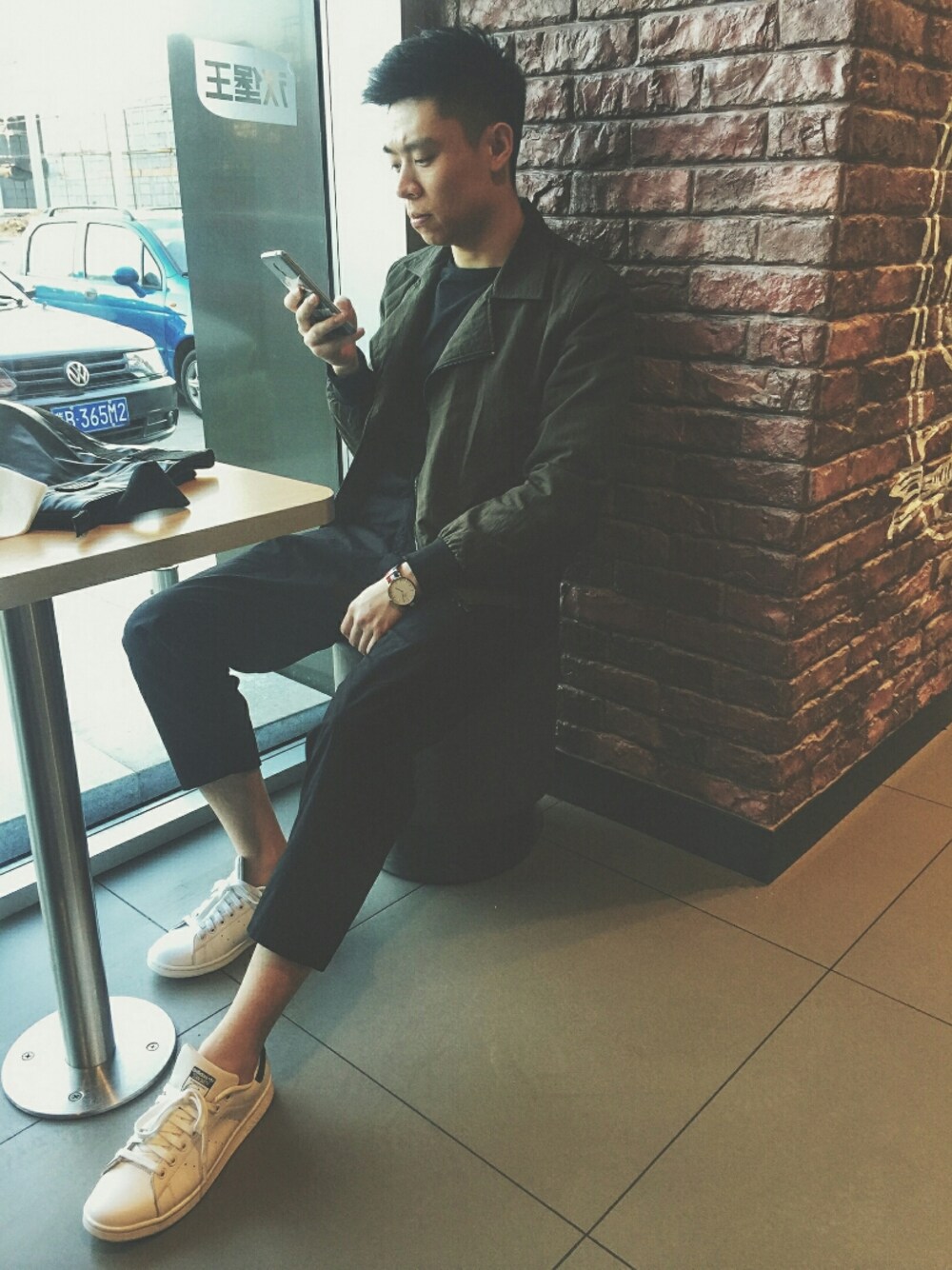 黑色连体套装外搭墨绿空军夹克,踩白色板鞋,打造极简“性冷淡”风格。 黒のスーツのほかに乗って连体深緑空軍ジャケット、足の白い板鞋を構築し、极简「セックスレス」スタイル。(すみません、私は日本語ができません、その文字は翻訳ソフトから来ます。)
