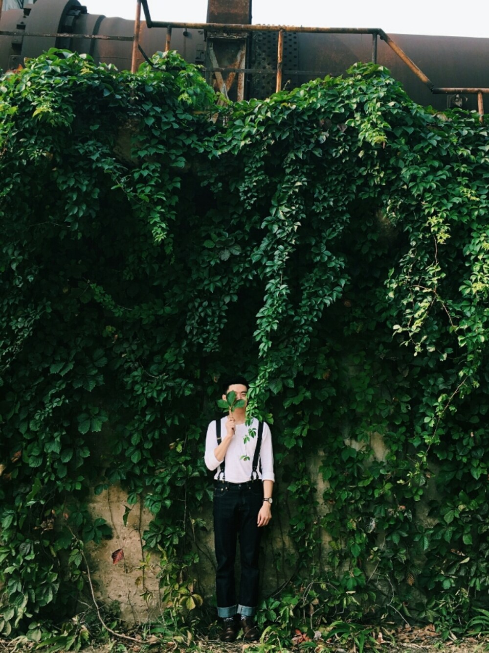 亨利衫卷袖,高腰赤耳直筒牛仔裤,棕色皮鞋,用棕色(复古背带和手表)加以上下呼应,打造匠气十足工装范儿。😏