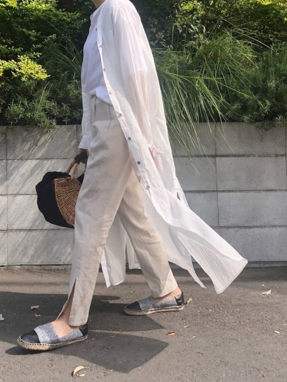夏のように暑いので、透け感のあるワンピースを羽織ってみました。 かごバッグとエスパドリーユを合わせて、涼しげな印象に。