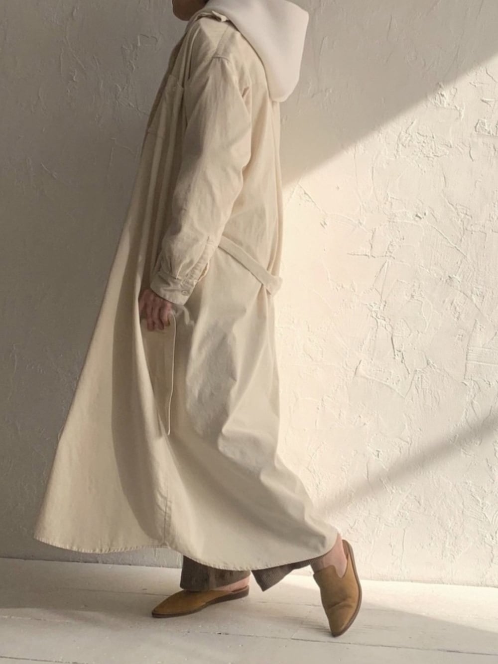 コーデュロイのシャツワンピからフーディをのぞかせて👀 ワンピはしっかりとした素材で、アウター代わりにも❤︎
