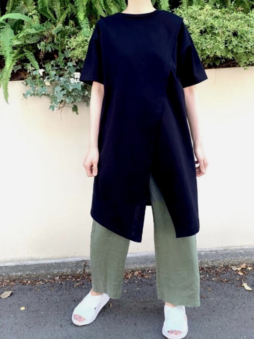 2WAYヘムT×リネンパンツでリラックス〜🏝 高級綿GIZAコットン素材のTシャツは、後ろがヘンリーネックになっていて、前後着用できる優れものです! 自然素材のコーデで、今日みたいなジメジメした日を乗り切りましょう。