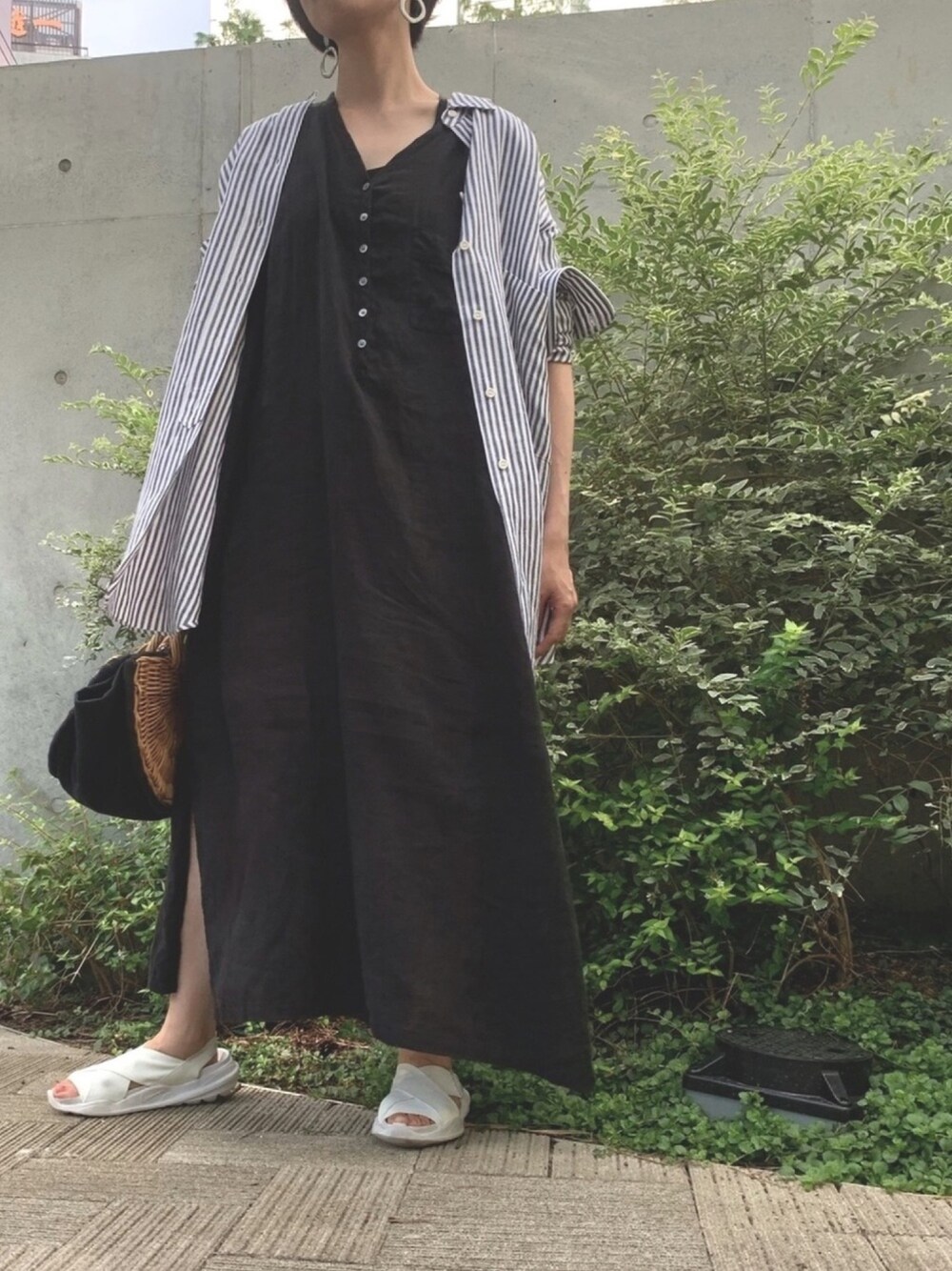 体が泳ぐオーバーサイズのワンピースとシャツのレイヤード。 どちらも涼しげリネン!洗えるのも魅力🧺
