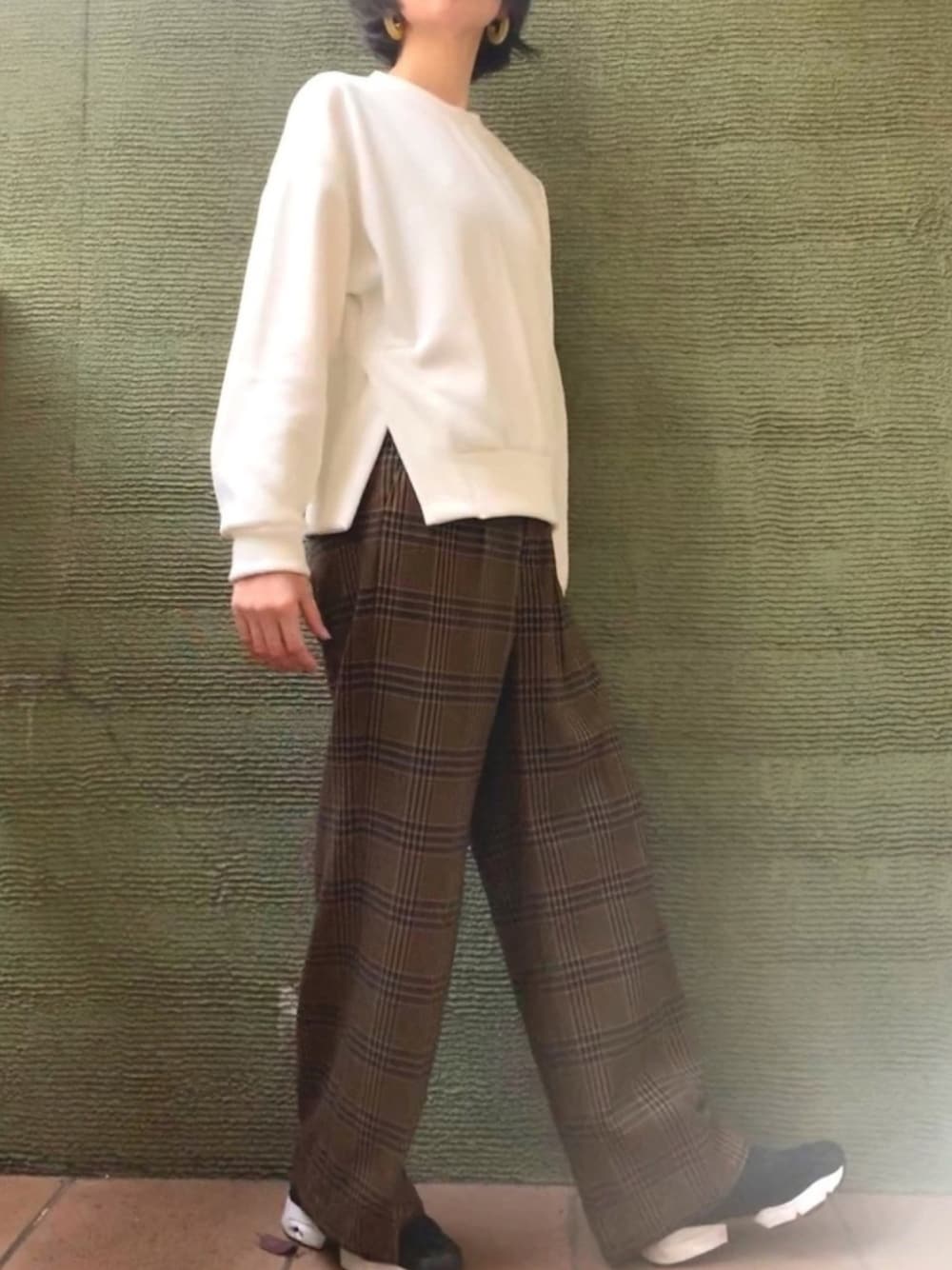 スリットが可愛い❤︎あったか白スウェットに、 キレイめチェックパンツで、大人カジュアルに🙋♀️
