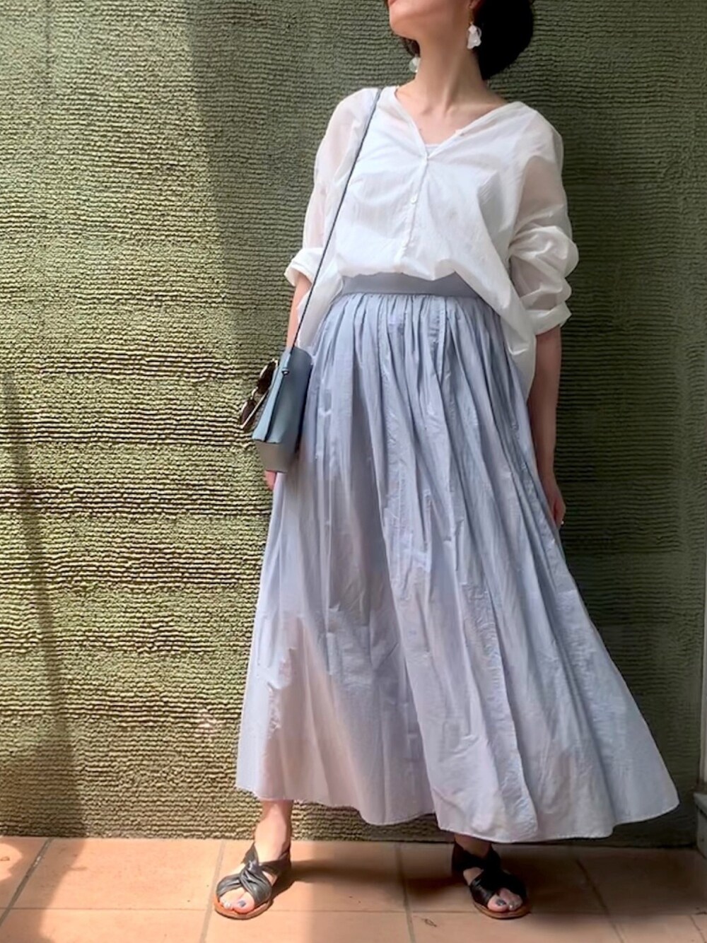 涼しげな白シャツとブルーのスカートで爽やかに🦋 蒸し蒸しした日も快適にすごせる素材感です😊