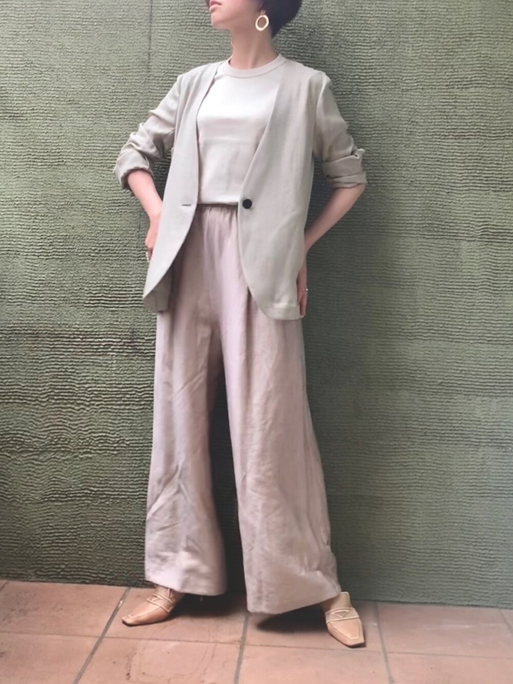 上品な光沢感がお気に入りのリネンパンツ🌞 ベージュ系でまとめてお仕事着にも使えます👓
