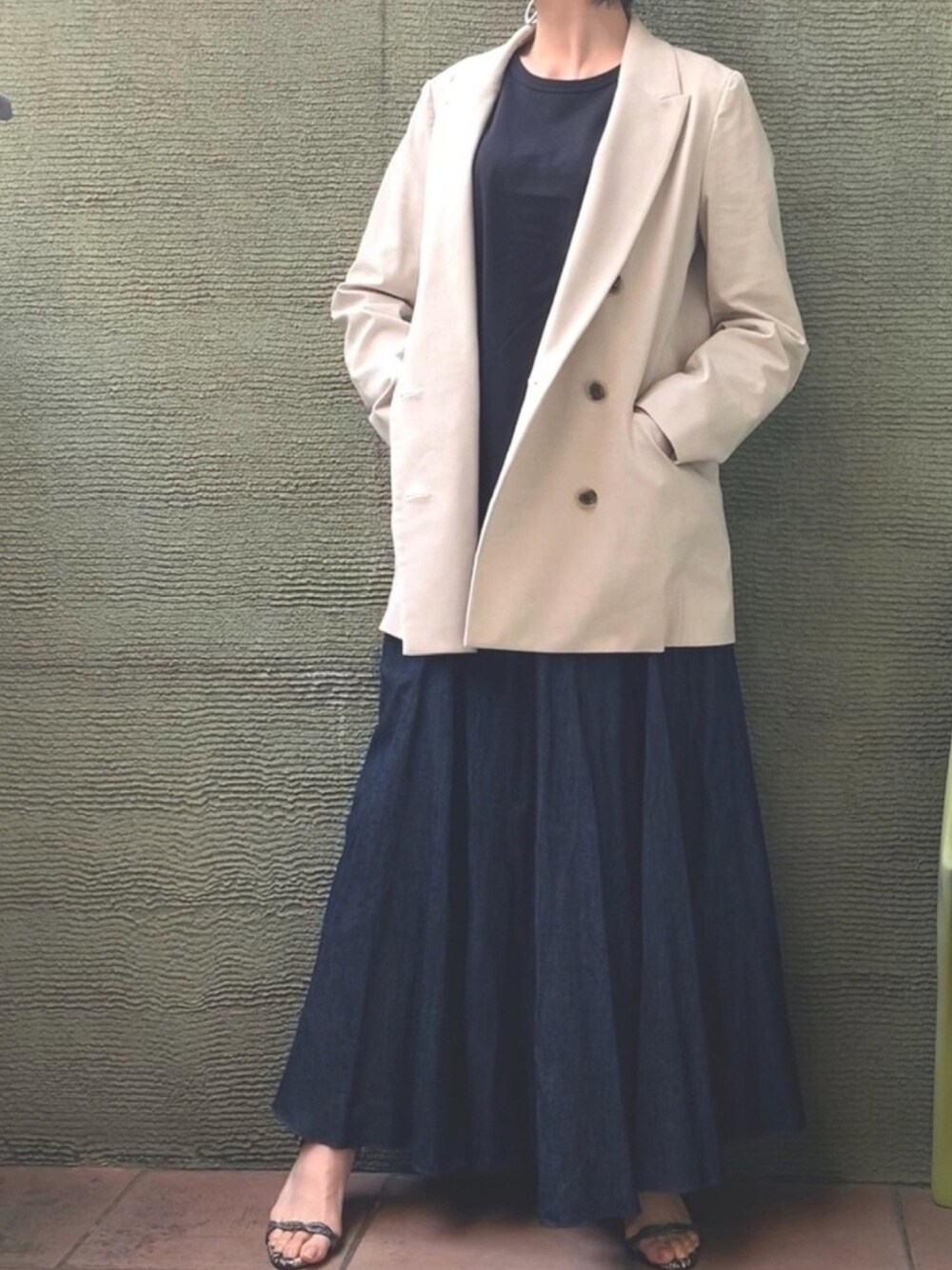 テーラードジャケットを羽織ってすっきりと✨ シワになりにくい素材感で使いやすく手放せません🙆‍♀️
