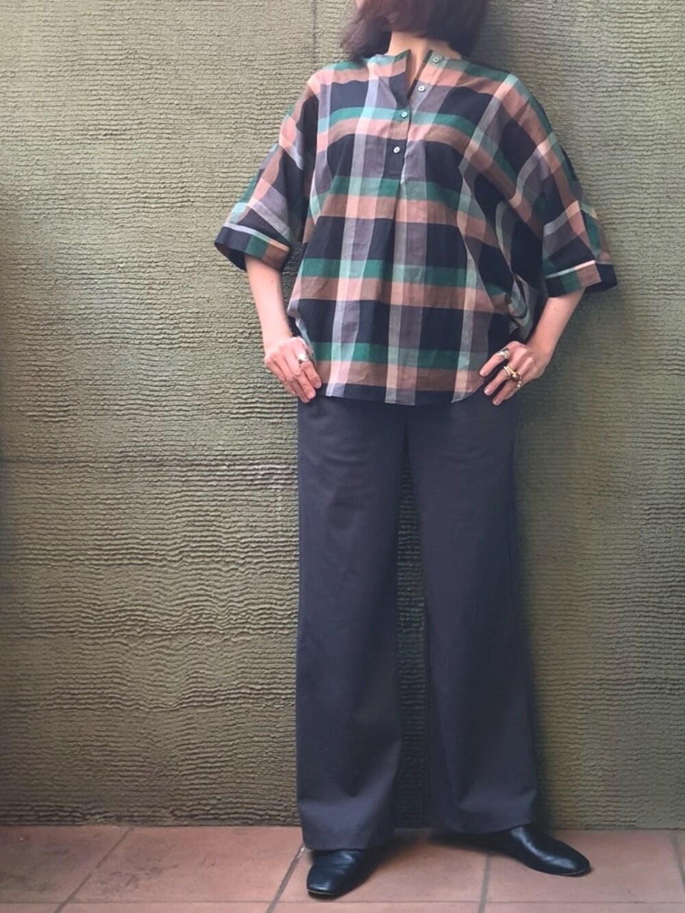 チェックのブラウスとジャージーパンツのリラックス感たっぷりのコーデ✨ 休日にもおすすめです😊