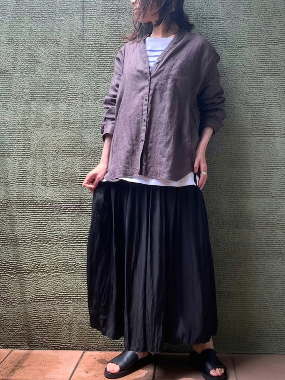 リネンシャツアウターは、ゆとりがあるので、オーバーサイズ気味な長袖カットソーにレイヤードしても決まって便利です😊