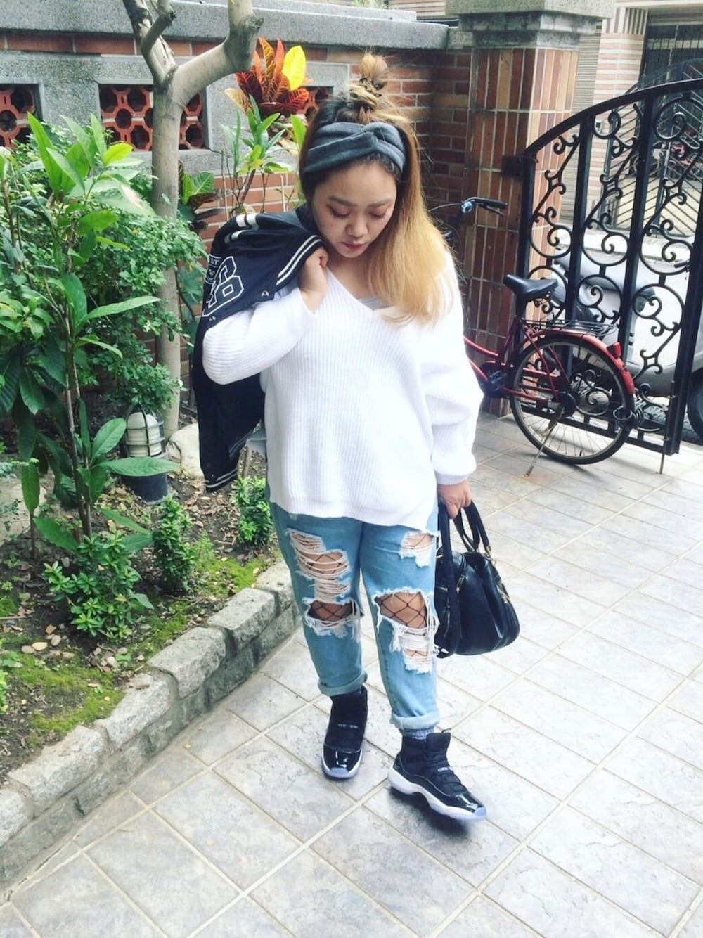 台北網襪搭配look2 破壞淺色牛仔褲,內搭大網格網襪 白色露肩毛衣搭配素色寬版髮帶 歐美街頭風get ✔️✔️✔️ Aj11是亮點啊~好好看~