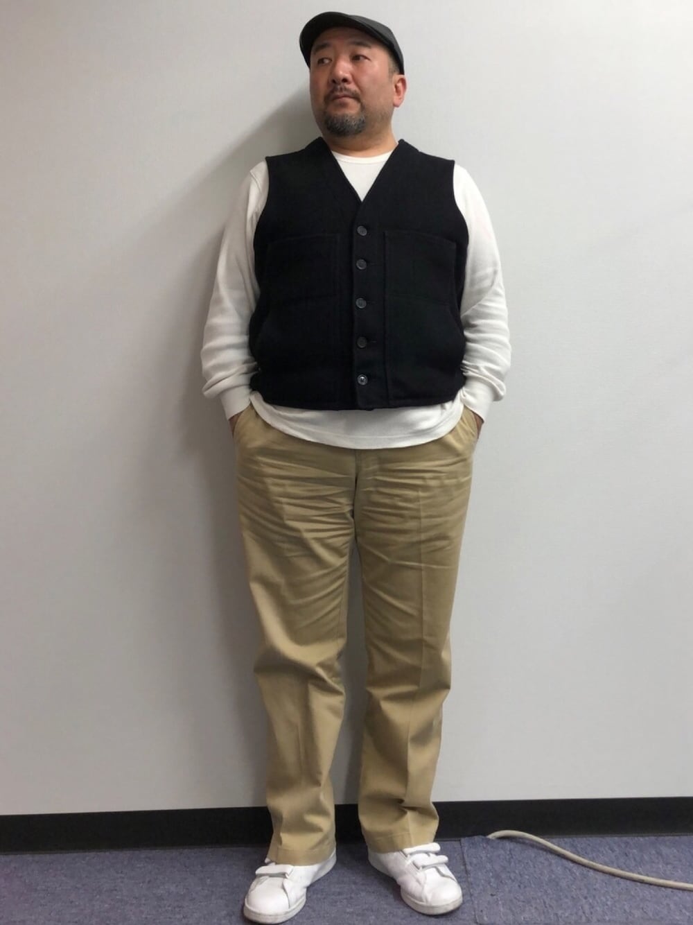 天気予報では夏日、真夏日の声が聞こえてくる今日この頃。 なのに、ウールのチョッキ着た写真……約1か月前の写真ですから。。。 もう、このチョッキはタンスにしまってあります。 でも、今でも夜になるとこのくらい着ててもいい感じの気温じゃないですか? だいぶ期間が空いてしまいました。気がつけばもう6月。今月初の投稿です。光陰矢の如し。あっという間に時間が過ぎてしまいますね。 白×黒×ベージュでシンプルにまとめました。スタンスミスのベルクロのスニーカーは、去年買ってあんまり履いてなかったんですが、今年はほとんど毎日こればかり。 履いたり脱いだりが楽チンで、つい「これでいいや!」と出かけてしまいます。 「どうしたらいいんだろう?」と考えることが多い、今日この頃です。考えたところで、いいアイデアも浮かばないんですが。 若い頃は、こういうときは「考えてるのは時間の無駄」と切り捨てることができたのですが、最近はいつまでも悩んじゃう。 考えても見つからない答え。 大学生の頃にCDを買ったDevine & StattonのアルバムThe Prince of Walesに収録されている曲でLike a blind man。 この曲が好きで、今でもたまに聴いてます。 歌詞のShe is like a blindman in a dark room looking for a black catという部分、「探しても見つかりづらい」という喩えで使われる言い回しのようです。 「盲人が暗い部屋で黒猫を探す」なんてひどい喩えですが、今の自分の心境にぴったり。軽ーい声で、優しく歌ってくれるので、少し気持ちが軽くなります。