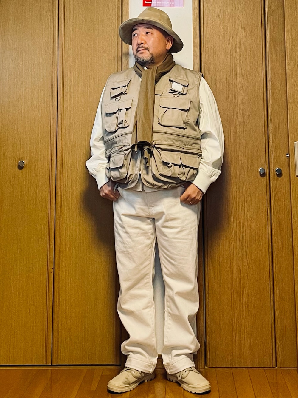 釣りですか? 山登りですか? ボーイスカウトの隊長みたいな格好でどこ行くの? コンビニにタバコ買いに行ってきます。サボってばかりいたら、いよいよ仕事がヤバくなってきたので、日曜日も働くぞー! しかし、二日酔いで午前中が潰れてしまうクズっぷり🥲 GUシリーズ第5弾はコットンMA-1ブルゾンです。2枚目の写真をご覧ください。柔道着! 白装束で切腹! 白いアウター持ってないから買ってみたんだけど……🥲 そこで、シャツみたいに薄い生地を活かして、完全にシャツとして扱うことに。ベスト着て、布巻いて、柔道着から隊長に変身! 多少の親方感は仕方ない。 ダメな気分を楽しめる音楽を聴きながら、反省して仕事しよう。シド・バレットの『The Madcap laughs(邦題:帽子は笑う…不気味に)』で、気持ちを緩めて。 →コメント欄のリンクから 中学生の頃、ラジオでピンクフロイドの「Another bricks in the wall」を聴いて、思春期の心に響き、アルバム「the wall」を買いました。ライナーノートで元メンバーのシド・バレットのことをテーマにしたと知ってから、ずっと聴きたいと思っていて、やっと聴いたのは大学生の頃。 ピンクフロイドの1stまではなんとかまともだったけど、薬物中毒と精神病でバンドを離れ、その後は一度も表舞台に立つことはなく、60歳でひっそりと亡くなりました。シド・バレットのことね。 彼が作ったデモを元に、ピンクフロイドやソフトマシーンのメンバーが仕上げたアルバム。カンタベリー派のサウンド。 シンプルで覚えやすいメロディーと、意味不明な歌詞、そして狂気を含んだ歌声。頭の中に直接話しかけてくるような作品です。 あ、仕事は?