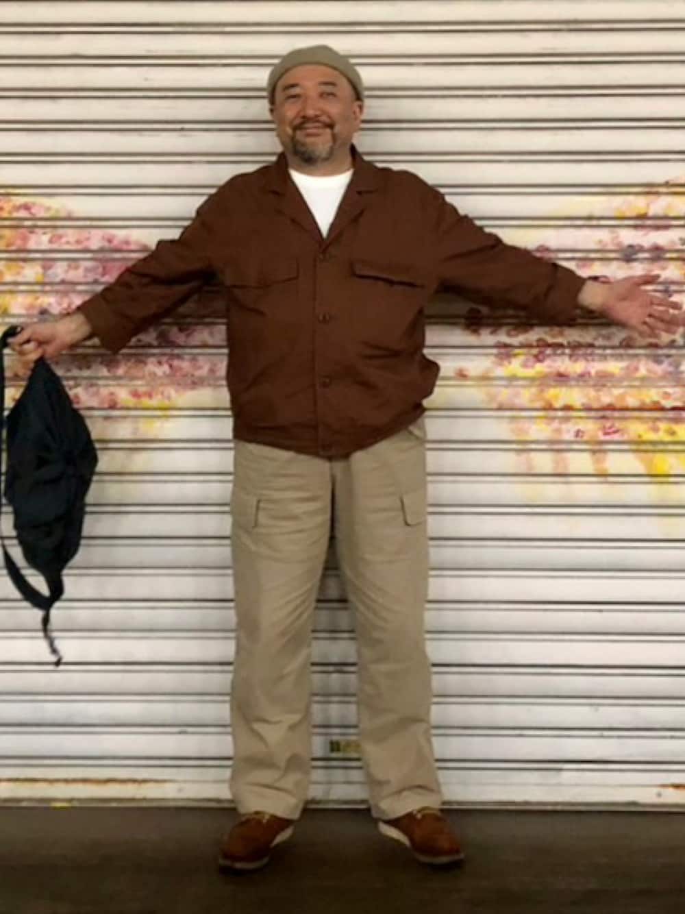 今もまだあった、広げた翼が描いてあるシャッターの前で。 また帽子と靴以外はぜんぶユニクロ😀 アイゼンハワージャケットみたいな、ショート丈のジャケットなんだけど、身幅に合わせて買うと丈はぜんぜんショートじゃない。ポケットいっぱいあって便利。 なんとかスレスレで作業服じゃなく見えるかな。ミリタリー感も控えめで。色のおかげかな? 秋みたいな色だけど。