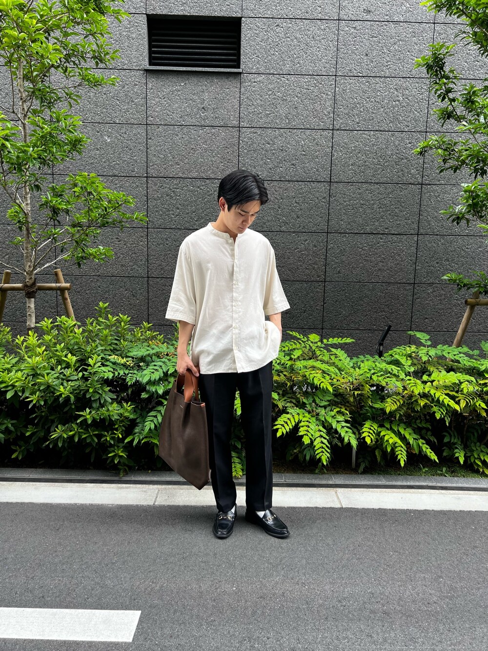 <シャツ> ヘンプ素材を使用したマオカラーシャツです。 素材特有の軽やかさと上品な表情が夏の主役を担ってくれるおすすめアイテムです! 気温30℃近くありましたが、通気性も良いので涼しく過ごせました◎ <リネン混スラックス> ウエストゴム+ドローコードの嬉しいイージー仕様◎ またUR TECHシリーズなので「接触冷感」「UVカット」「吸水速乾」「ピリング防止」機能があり、取り扱いも楽です! <バッグ> A4サイズ荷物も入る収納力もありながら、お洒落なレザーバッグです。 オンオフ問わず使用でき使い勝手の良いアイテムです!!!