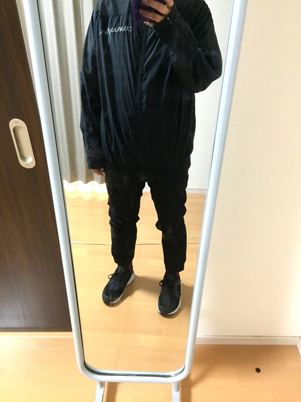 皆さん、こんにちは。 いつも、イイね、SAVE、フォローして下さる皆さんありがとうございます(=゚ω゚)ノ 今日は、週に5回程は夜に行っている散歩スタイルですw 犬の散歩とは銘打ってはいますが、実質ポケモンGOをする為に行っているようなものです(笑) 嫁さん命名の「ポケさんぽ」ルックです。 ほぼ黒です。夜に紛れて見えにくいです。 危険回避の為にリアルに蓄光ソールのグロウインザダークのスニーカーが欲しいですw トップスは大分昔にブランド古着店にて購入したGDCの初期物のジャージです。多分、GDCがデビューしたばかりのものなのでブランドネームもグランドキャニオンです。 ジャージといっても形がジャージなだけで生地はナイロン素材です。薄手で大きめサイズのため秋〜春まで長い間着れます。インナーにパーカー着たりと色々着回し効きます。 スニーカーは気に入って買ったのに、最近はほぼぽけさんぽ専用と化していますw 履き心地良く、軽く、フィット性あり、足が疲れないので歩くのにピッタリです。 大体一回のポケさんぽに4〜5キロ、2時間程は歩くのでハラチは重宝します。 最近の好きなコーデはスポーツテイストでなくなってきてるので合わせ辛くなってます。 スニーカー8足➕サンダル1足あるので、他でことが足りてるようです( ;´Д`)