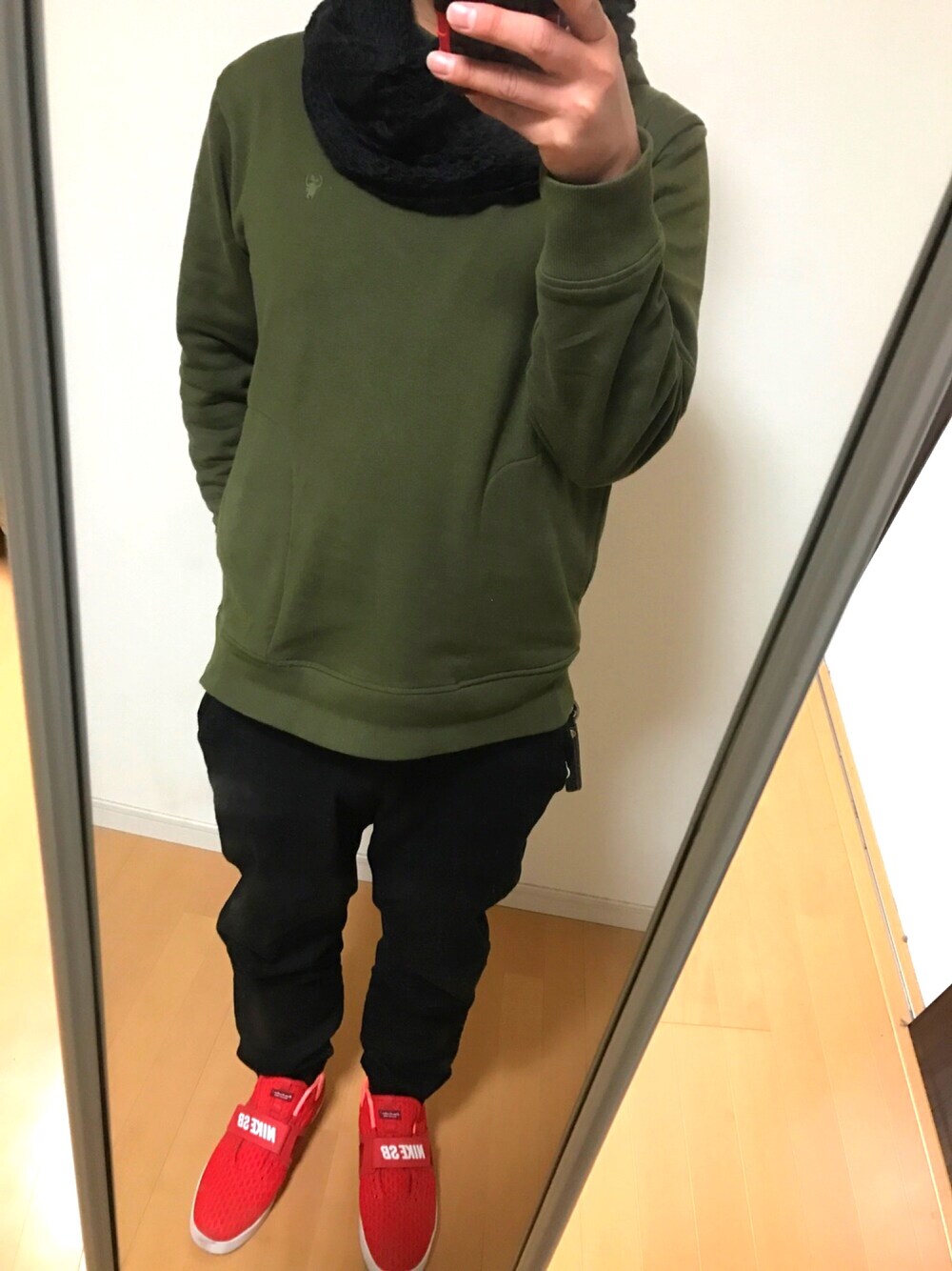 皆さん、こんにちわ。 今日は、用事でダイソーに行ったら300円でスヌード売ってたんで買ってみました(о´∀`о) 初スヌードなんで造りなど違いが分からないんですが、なかなか暖かくてゆるいし重宝しそうです。 実は昔から首が詰まった服が苦手でタートルとかハイネックを着ません。 これならゆとりがあるので苦手な感じがなくいいですね〜 コーデ自体は、カーキのパーカーに黒のジョガーパンツ、赤のスニーカーにサイズ感もゆるく、楽チンスタイルです。