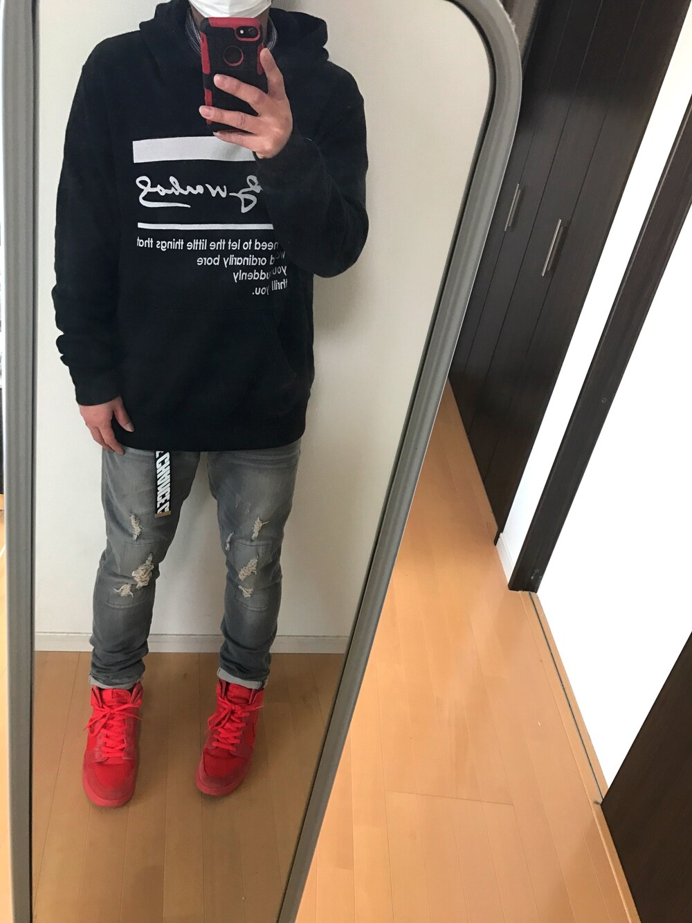 皆さん、おはようございます😃 何だかお久しぶりです。 暖かくなるとパーカーばかり着ている気がしますw 冬服はアウターが主に黒ばかりで写真にあまり違いが分からないし、春や秋の時期の薄手な服はあまり持って無くて… 最近、コーデがマンネリ化してきてるのでアップは控えてました。 少しづつアップ出来ればと思っています。 今回はパーカーだけでは寒いのでインナーに昔GLOBAL WORKで購入したギンガムチェックシャツとロンTが合体したモノを着てます。 丁度スマホを持つ手で隠れてますがw パンツは久しぶりにダメージデニム、色味がないので足元に赤の差し色持ってきました(*´ω`*)