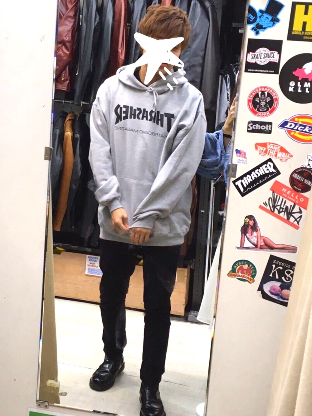 アメ横にてスラッシャーのパーカーをオーバーサイズで試着してみました! このくらいの時期だと一枚羽織りで結構暖かくて良いと思いました!