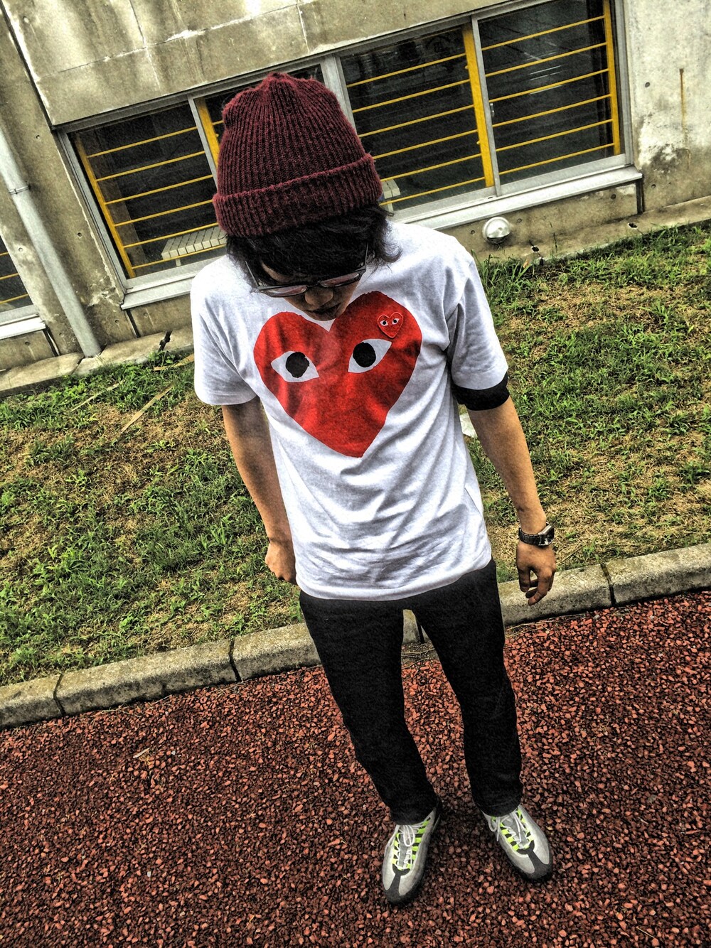 Tシャツ : PLAY COMME des GARCONS ズボン : UNIQLO 靴 : NIKE 時計 : WIRED 眼鏡 : Rayban 僕の孤独が魚だったら 巨大さと、獰猛さで、 鯨でさえ逃げ出す きっとそうだ .