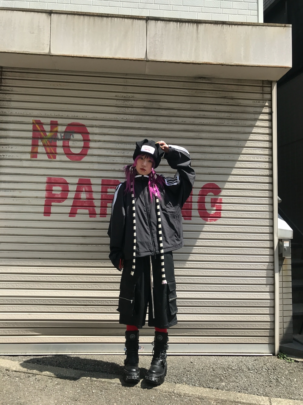 今日はブラックスタイリングです🐦⬛🐦⬛🐦⬛ 🎓LOVERBOY 👚adidas 👖Danke Schon 🛼 newrock