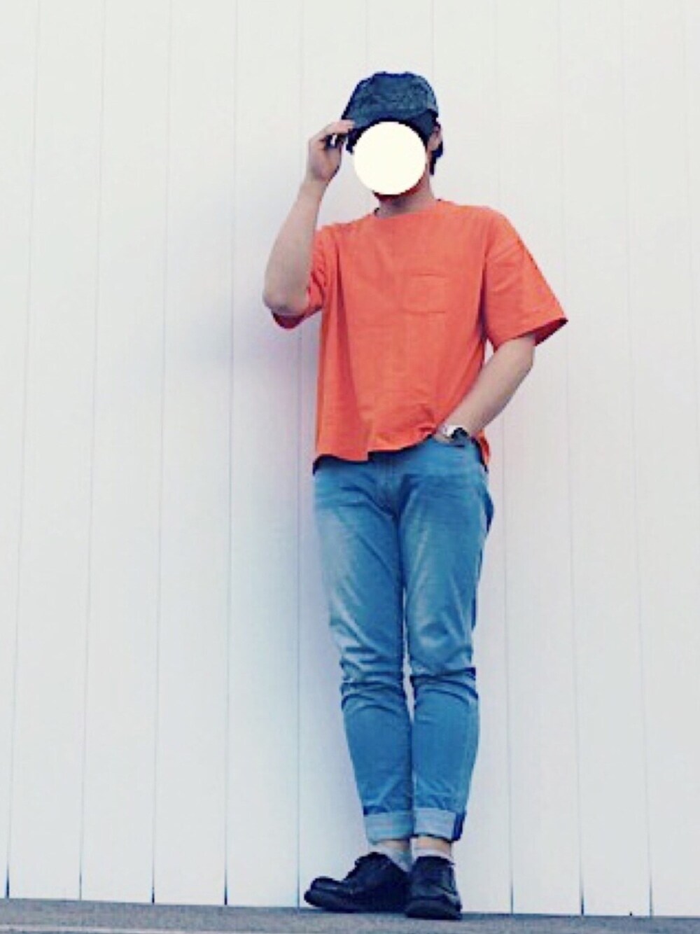 おはこんばんにちわ! スタイルよく見せたくて少し低めの位置から撮影してみたよ〜😛💫 なぜか画質悪くなったけども🤔❓ コーデは夏らしくシンプルに☺✨ オレンジとブルーで色にメリハリしっかりつけたのがポイント☝⭐ 今日はこのへんで!じゃあ🙋♂️