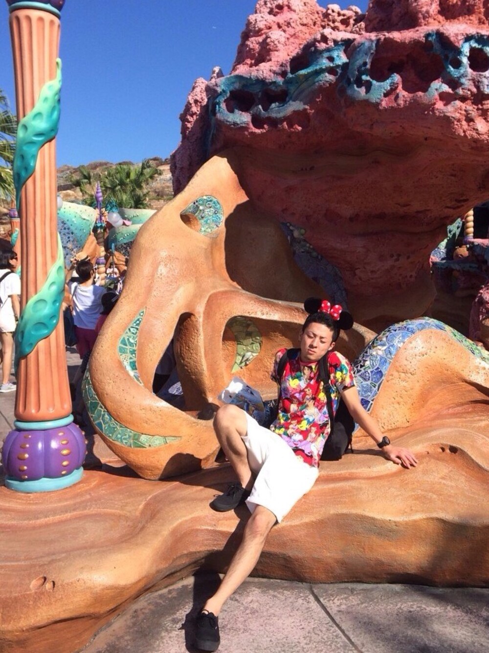 ディズニーシーにいってきました。 ミニーちゃんのカチューシャにアリエルのTシャツにスケータースタイルをミックスしオカマファッション感を少し和らげました。 みなさん熱中症にはご注意を!!!!