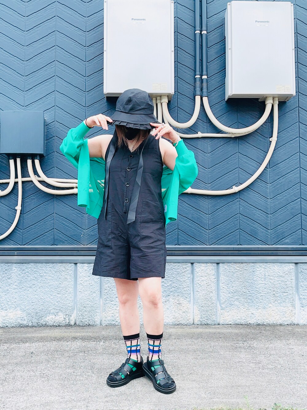 ご覧頂きありがとうございます⸜(*ˊᵕˋ*)⸝💕✨ 前回の投稿にイイネ♡save⊕フォルダin🗂 とても感謝しています(❁ᴗ͈ˬᴗ͈)ペコリ オールインワンコーデ 緑のカーデを差し色に シースルーソックス🧦可愛いんだけど グルカサンダルと合わせたの微妙だった…