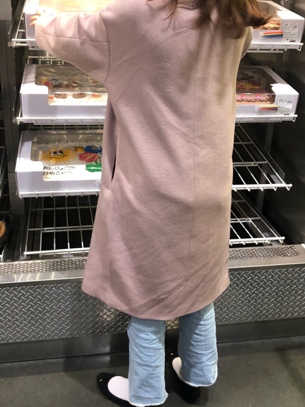 ピンク系のチェスターコート、ブラック系のバレエシューズ、ブルー系のデニムパンツを着用したレディースの冬コーディネートの1枚目の写真