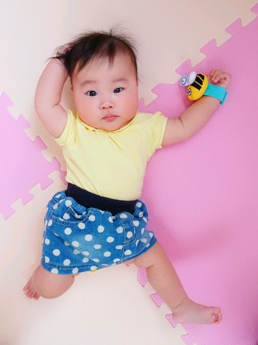 Kポーズ😄 70サイズの服がもうキツそうだぞ…笑 ずりばいが始まったらほっそりするのかな✨