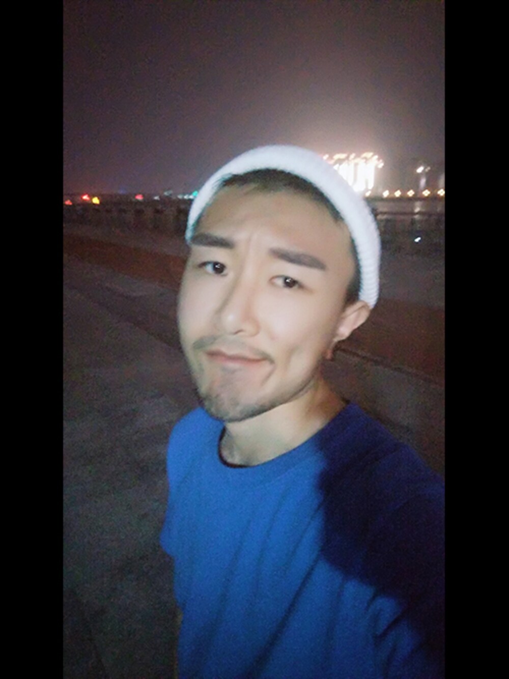 ブルー系のTシャツ/カットソー、ホワイト系のニットキャップ/ビーニーを着用したメンズの秋コーディネートの1枚目の写真