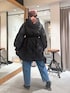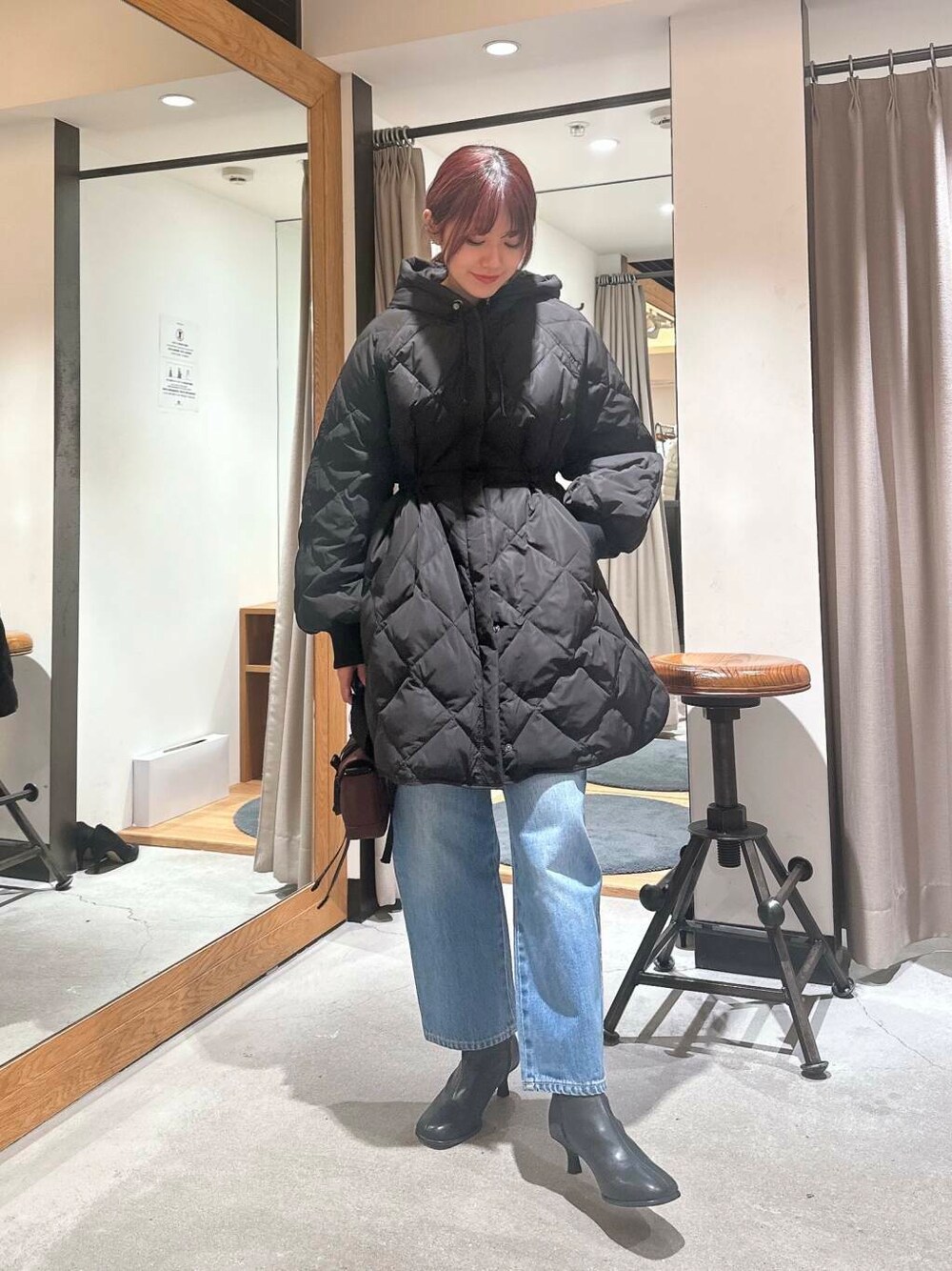ご覧頂きありがとうございます! ダウンは撥水加工されているので雨の日でも安心して使っていただけます◎ 写真はウエストをギリギリまで絞った状態です 下が広がるのでパンツ以外にも、落ち感があるスカートを合わせるのもオススメです☺️