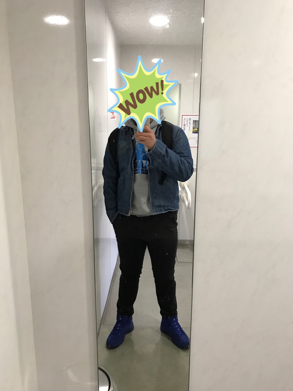 古着のデニムジャケットとグレーのパーカーに黒のパンツで落ち着いた色合いでまとめました。 差し色にパーカーのホイル加工のロゴと足元のAIRJORDANをブルーで合わせました。