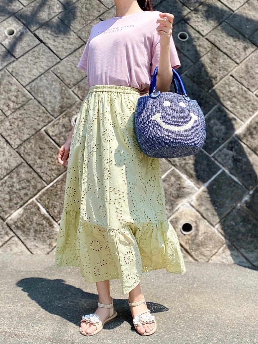 今日も見て下さってありがとうございます💕 ニコ☺︎ちゃんのカゴバック可愛くてお気に入り✨ Tシャツにスカート履くの楽だし可愛くてハマっておる✨
