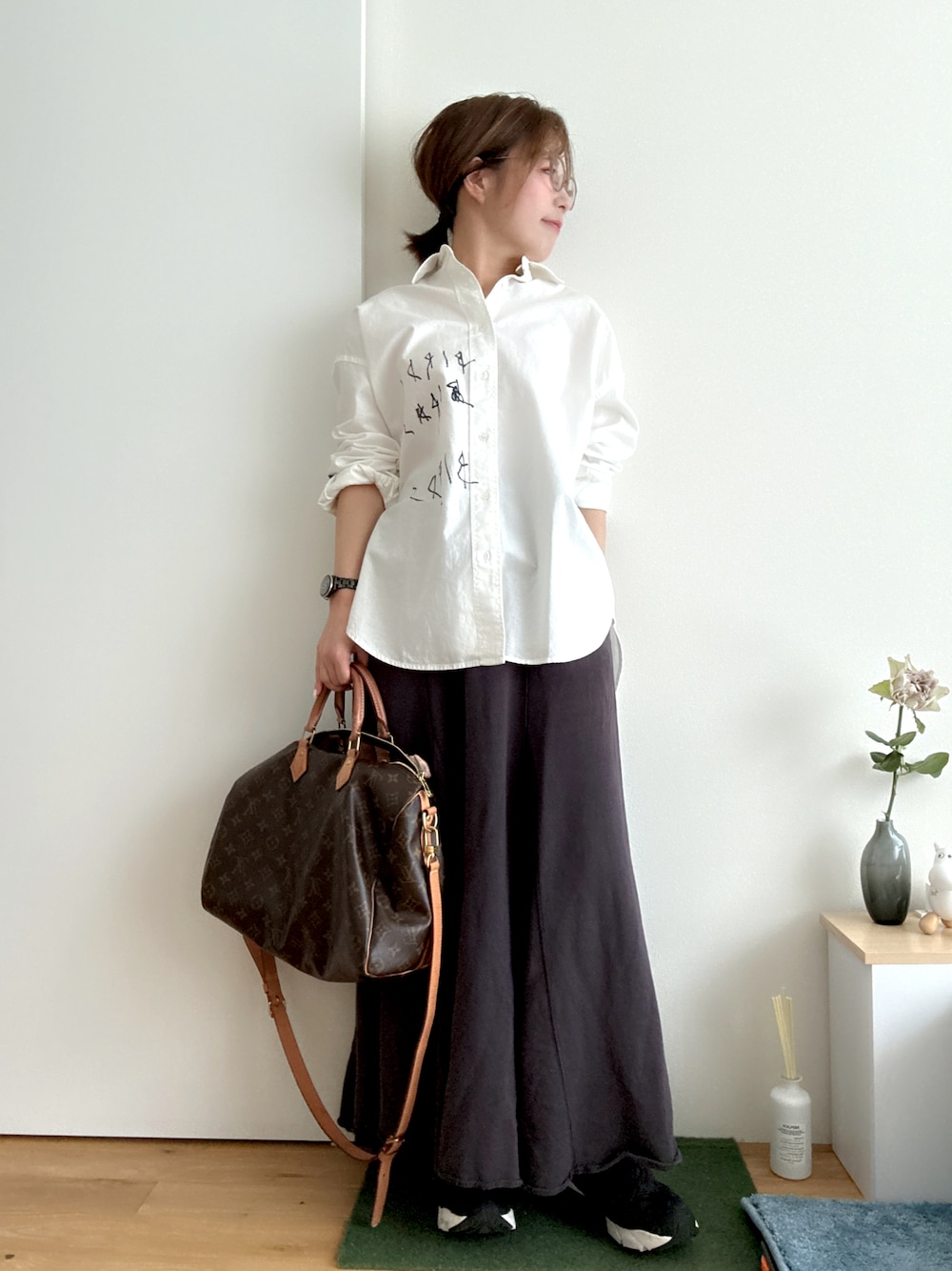 一枚でサマになるフレームワークの落書きシャツ😚ストンとしたシルエットにするためにアンティカのスウェットスカート合わせました。