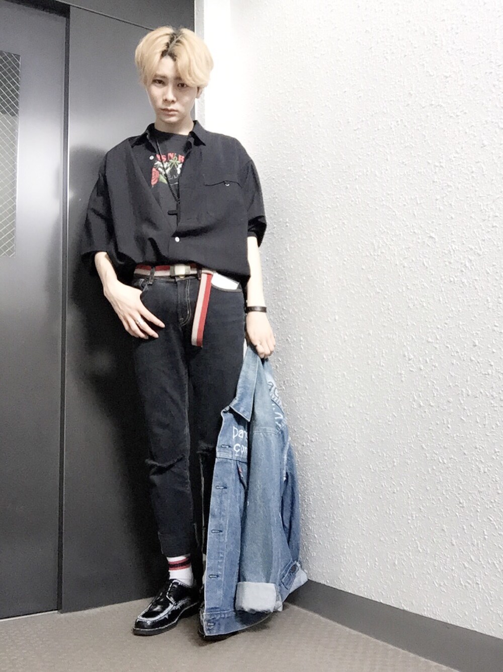 ブラック系のシャツ/ブラウス、ブルー系のデニムジャケットを着用したメンズの夏コーディネートの1枚目の写真
