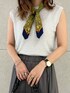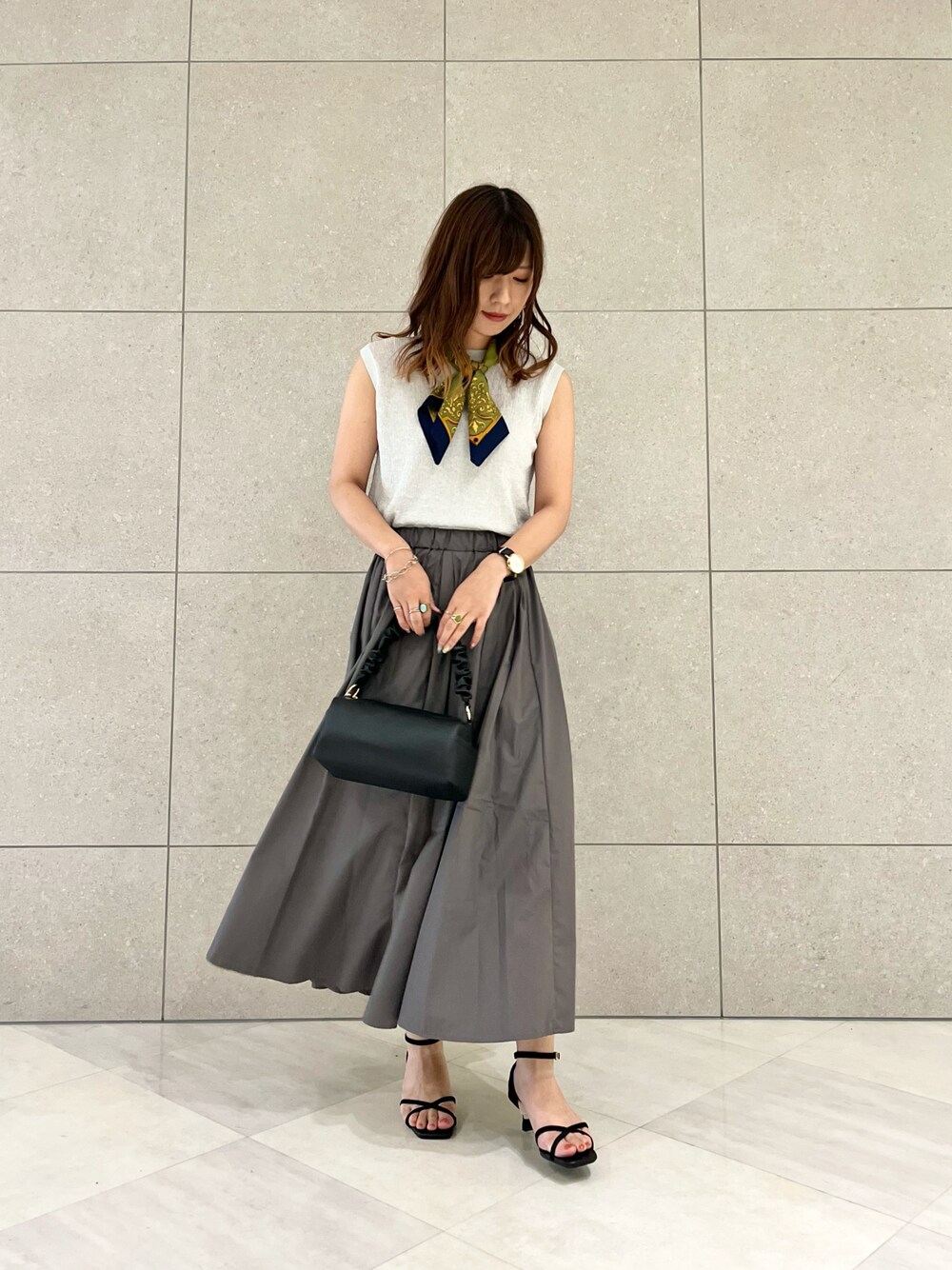 early autumn coordinate🔭🦔 シルバー×グレーのワントーンコーデに スカーフをプラスして華やかに♡♡ 夏アイテムもトーンが落ち着くだけで 一気にレディライクに💋💄