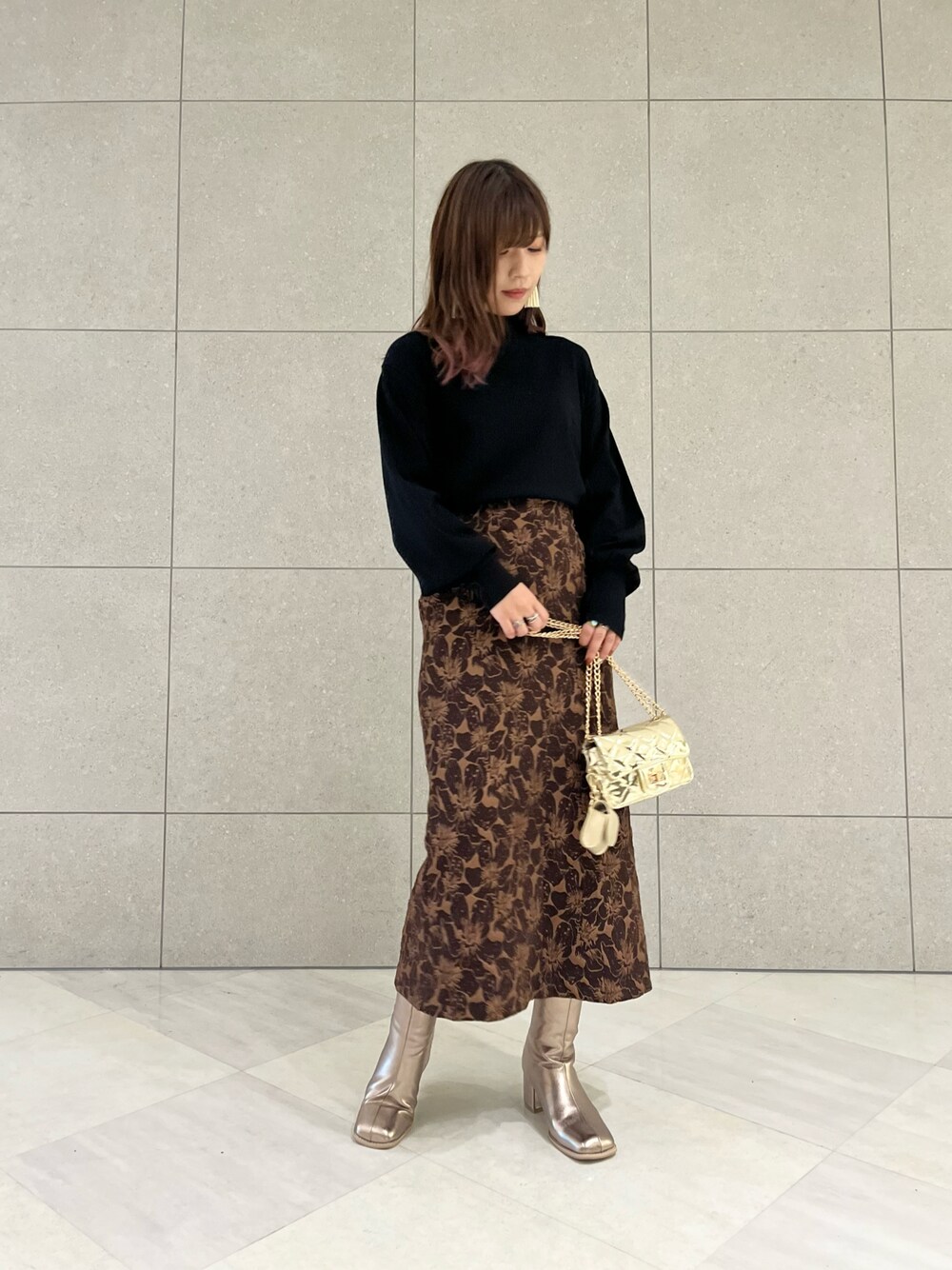 一目惚れのジャガードスカート𓂃🥀𓈒𓏸 スカートの柄を引き立たせたくて、 黒ニットを合わせてシックに着ました! 小物はメタリックで華やかなスタイリングに👍🏻 ̖́-