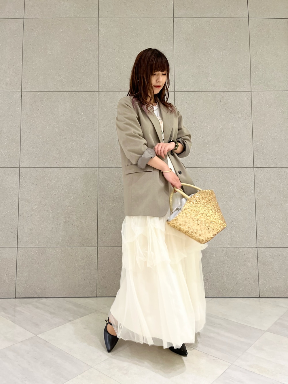 リアル出勤coordinateから着回しリレーday1🤭🧡 甘めなチュールスカートと くすみカラーのテーラードジャケットは相性抜群👌🏻 ̖́- Te chichiのテーラードジャケットは形綺麗で、 毎年必ずgetしてしまいます🤦🏻♀️💓 アウターinはオールホワイトでまとめがち。。