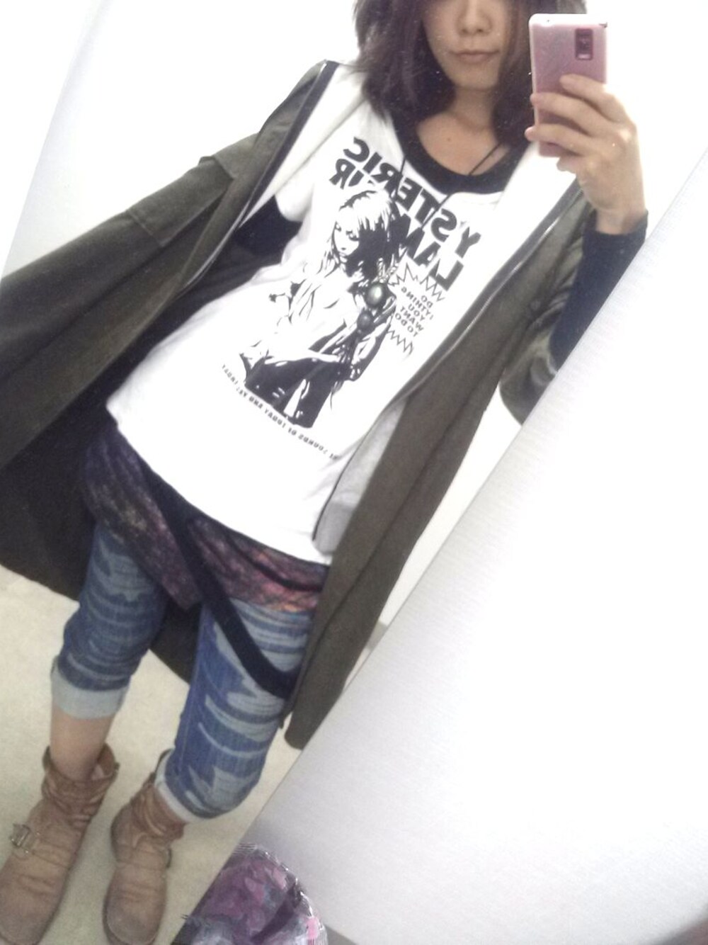 ガールプリントT/HYSTERICGLAMOUR デニムレギパン/忘れた タンク/memhim ロンT/モノクローゼット パーカー/MIHARAYASUHIRO みはらくんのパーカーくんがお気に入り過ぎてドキがムネムネ