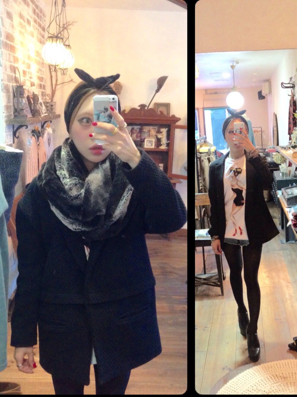 クリスマスイブイブ🎅 ベロアターバンとパールスパイクピアス、大判ファースヌードで顔まわりを華やかに。。 寒いのが嫌いで冬は買い物に出歩きません😭 かっちりジャケットに、プリントがツボなTシャツはOPとして🙀❤️