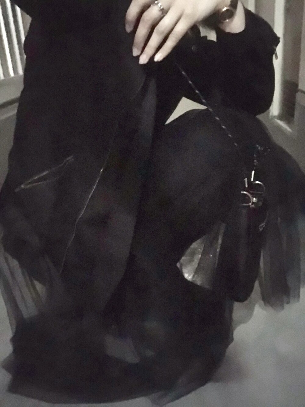 今日はほんとにオーールブラック めったに履かないスカート ヒラヒラと 動きがある服がすき アクセサリーは動いてない時計と ハタチの時に買ったvivienneリング