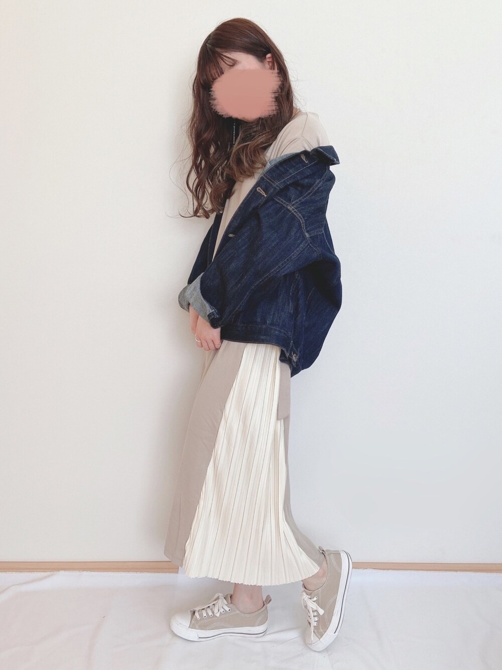 おはようございます\(¨ )/♡♡ いつもありがとうございます⌄̈⃝♥ ベージュ×デニム♪♪ ワンピースにオーバーサイズのデニムジャケットを 合わせたらめっちゃかわいくなった✩.*˚ 足首を見せるとバランス良く着れます✨ ❁Instagram❁¨̮ →yuririn_wear