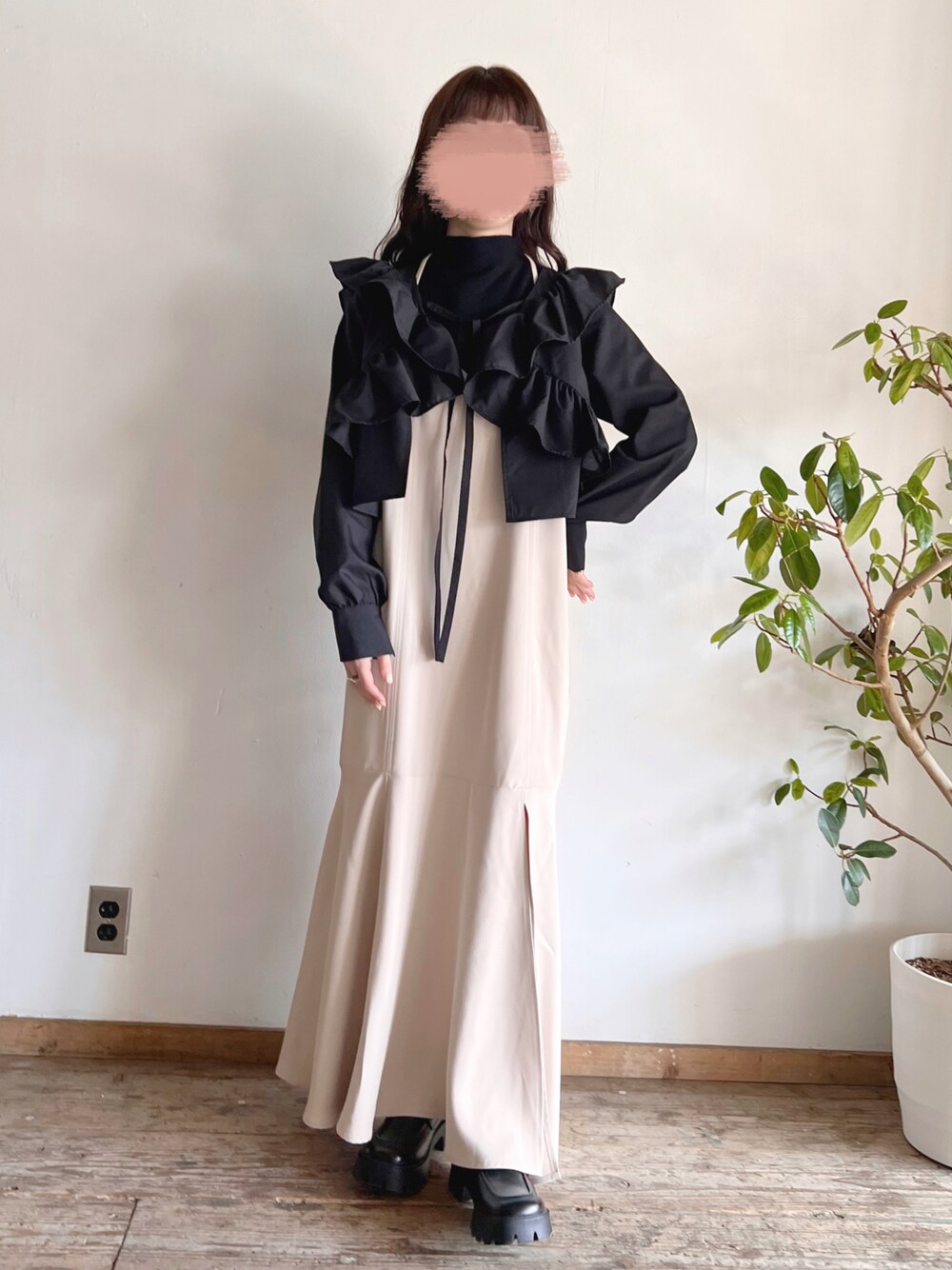 おはようございます\(¨ )/♡♡ いつもありがとうございます⌄̈⃝♥ モノトーンコーデ▹▸ 珍しくモノトーンコーデ🫧 甘めのブラウスもブラックなら 大人っぽく着れるから好き🌷 ❁Instagram❁¨̮ →yuririn_wear