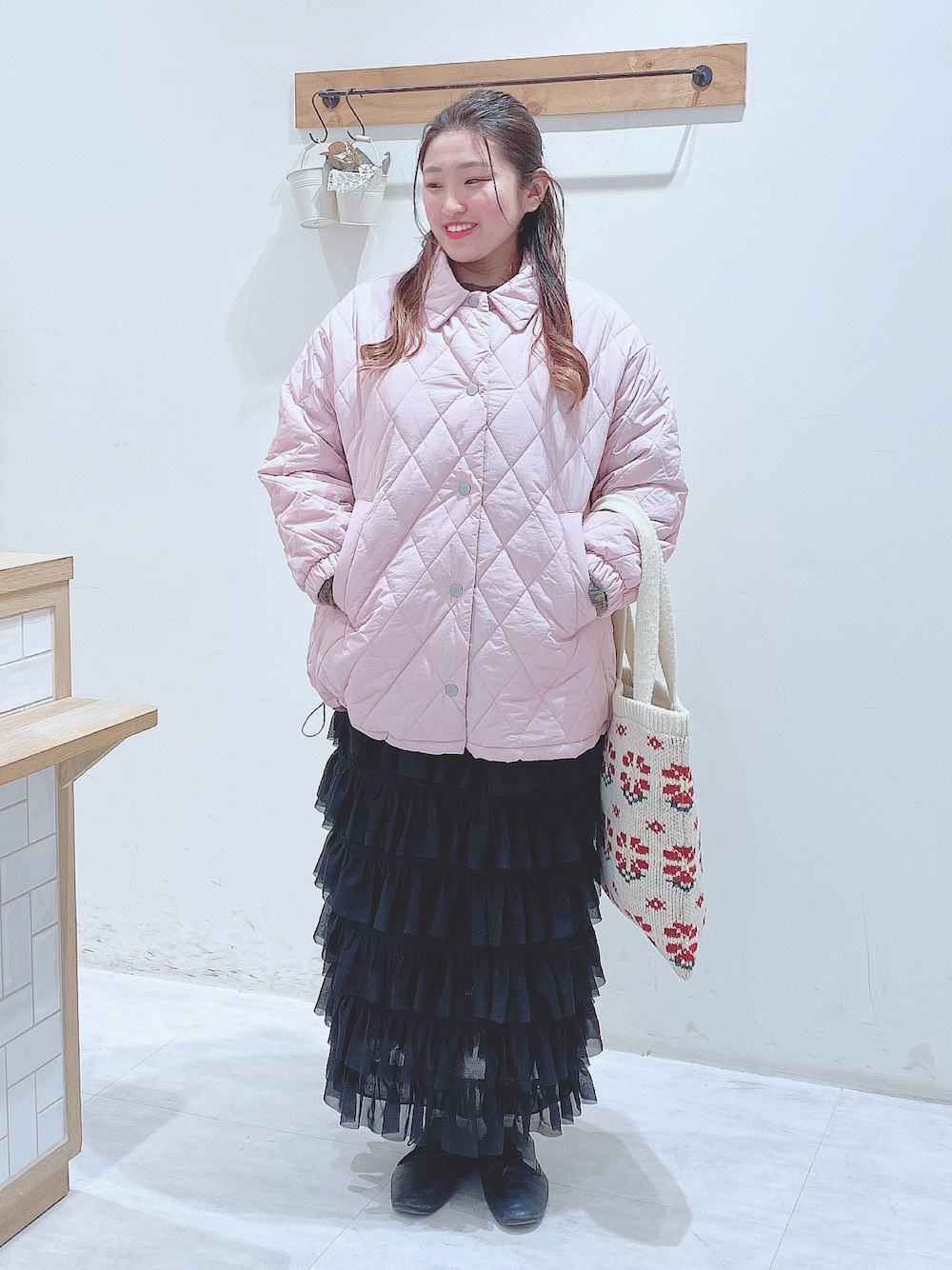 ♡ご覧いただきありがとうございます♡ トレンド感のあるコーディネートをしました! キルティングジャケットはバラクラバ付きです😊 そして、フリルティアードスカートを合わせてトレンドを意識しました✨ どのアイテムも可愛いらしい雰囲気をつくってくれます♪