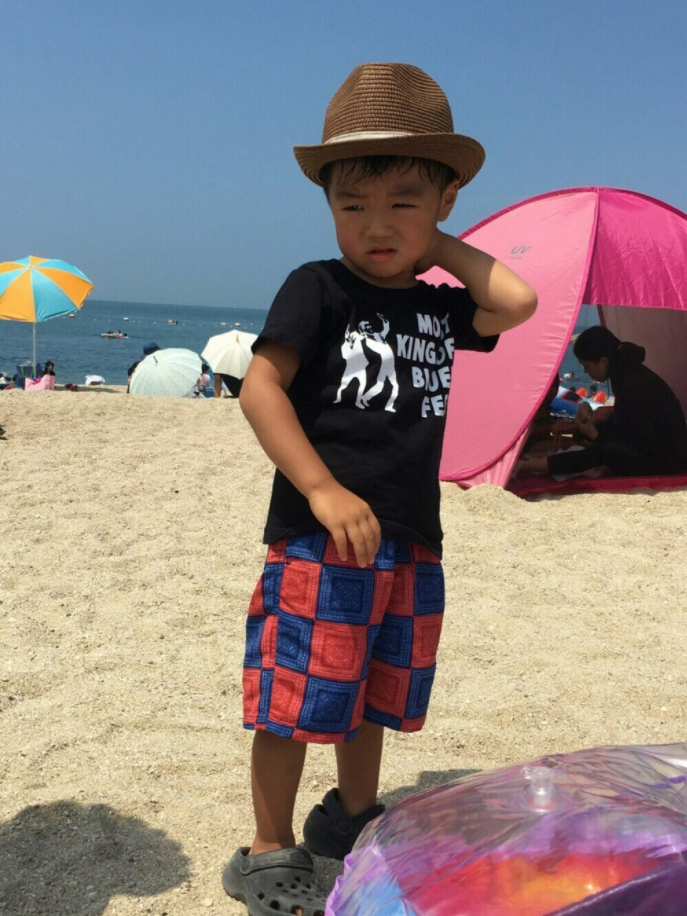 今日は今年初海♡ 到着までに汗だくになり、少しご機嫌ななめフェイス(笑) でも、浮輪で浮けるよーになって、楽しんでます♡ 水着、3つくらいあるけど、気がついたら全部赤、白、青。笑 母の好みが全面に出てます(笑) そして実は母も水着着用です(笑) ラッシュガード、UVカットレギンス、ショートパンツにて、水着は1ミリも見えません(笑) 紫外線が恐怖過ぎる。。。