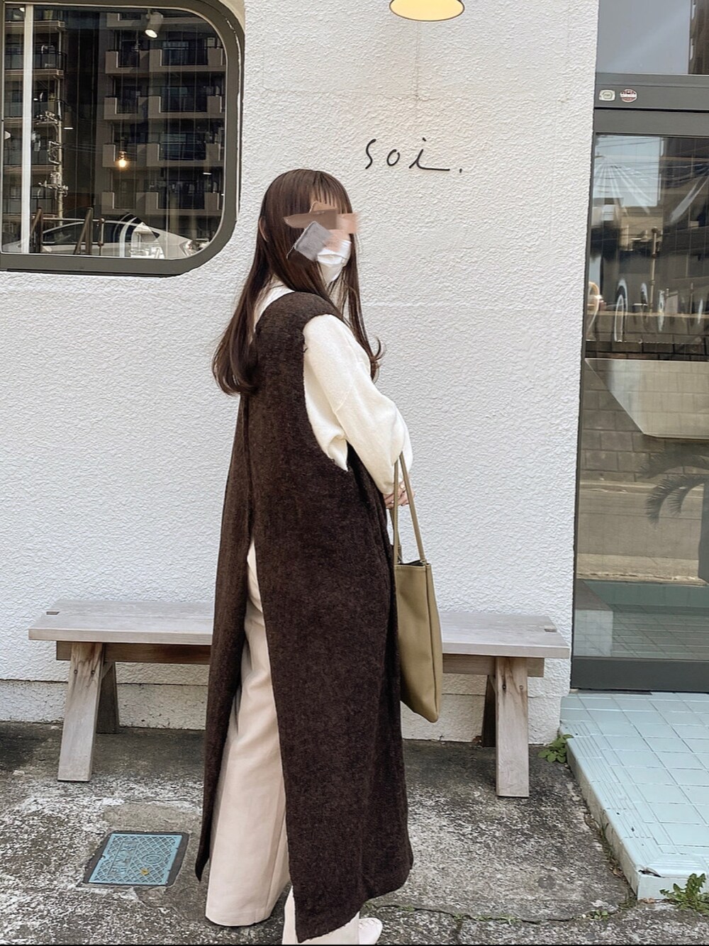 y12riのワンピース「ミックスブークレーニット深Vネックベストワンピース」を使ったコーディネート