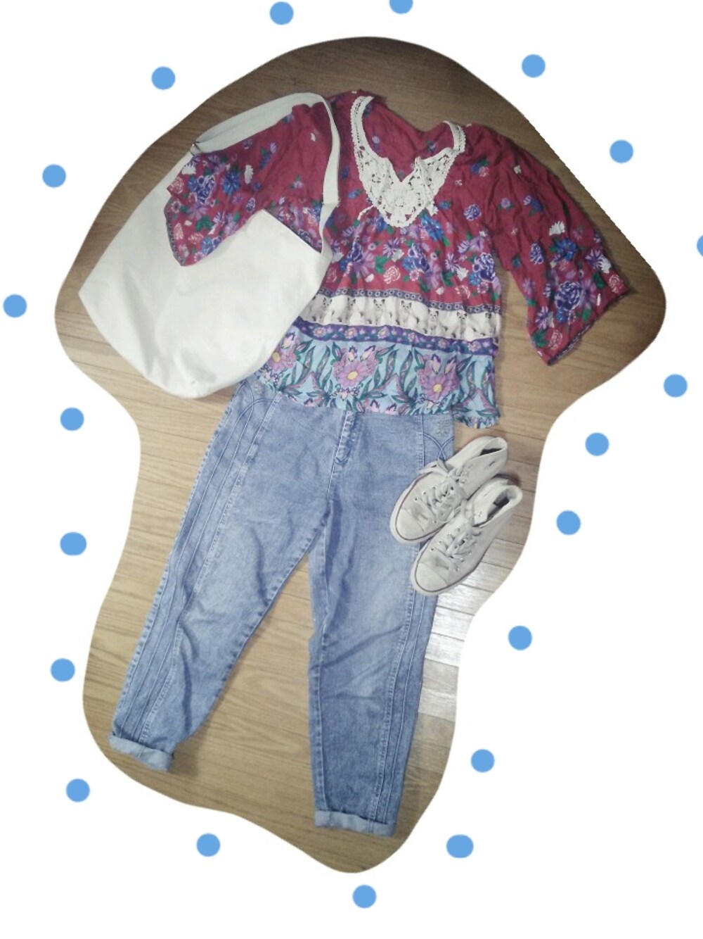 適当におだんご。トップスに猫。 トップス scolar デニム 古着 バッグ mikoa スニーカー CONVERSE