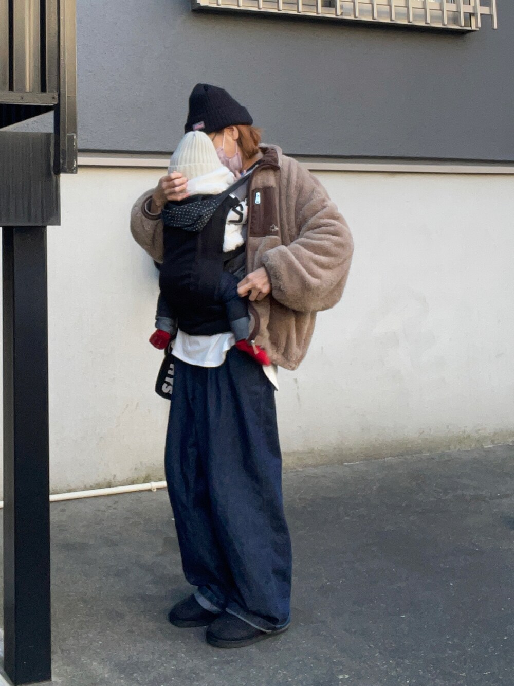 マタニティ期に履ける様に買ったGUのメンズタックデニム、いい感じにゆるずるる。緩すぎてめちゃくちゃ紐縛ってるけども。 娘のボトムもインディゴカラーで合わせました😊