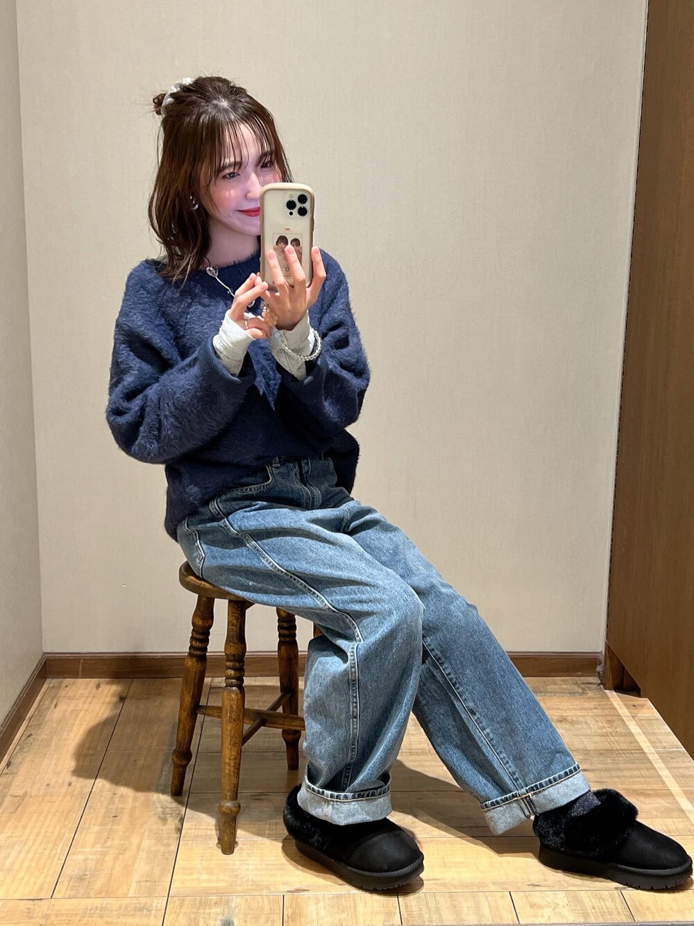私の好きなカジュアルスタイリング!! ブルーでまとめたワントーンコーデに なります!! グローバルワークの新作ニット シャギーニットチクチク感がなく 敏感肌の私に最適♥