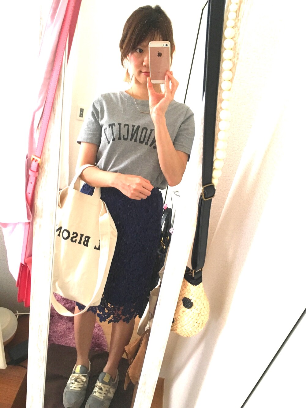 暑いあつーい💦 台風過ぎたら夏に逆戻りですね🌀 秋コーデ断念😨 せめてもの気持ち?笑 サンダルやめて、スニーカーにしました👟 でも1回やってみようと思っていた ロゴT×レーススカートコーデが 出来たので、良かったのであります✌︎✨